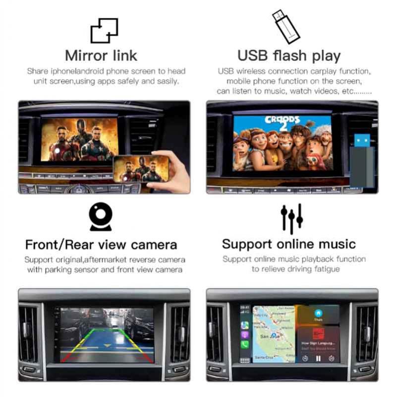 Dieses kabellose Carplay ist zu 100 % für Infiniti geeignet und unterstützt die werksseitige Rückfahrkamera und das Parkradar.